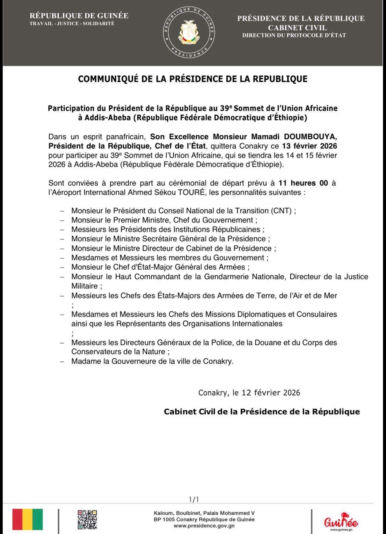 Le Chef de l’État guinéen quittera Conakry le 13 février 2026 pour prendre part au 39e Sommet de l’Union africaine, prévu les 14 et 15 février à Addis-Abeba, en République fédérale démocratique d’Éthiopie, selon un communiqué de la Présidence de la République.Communiqué