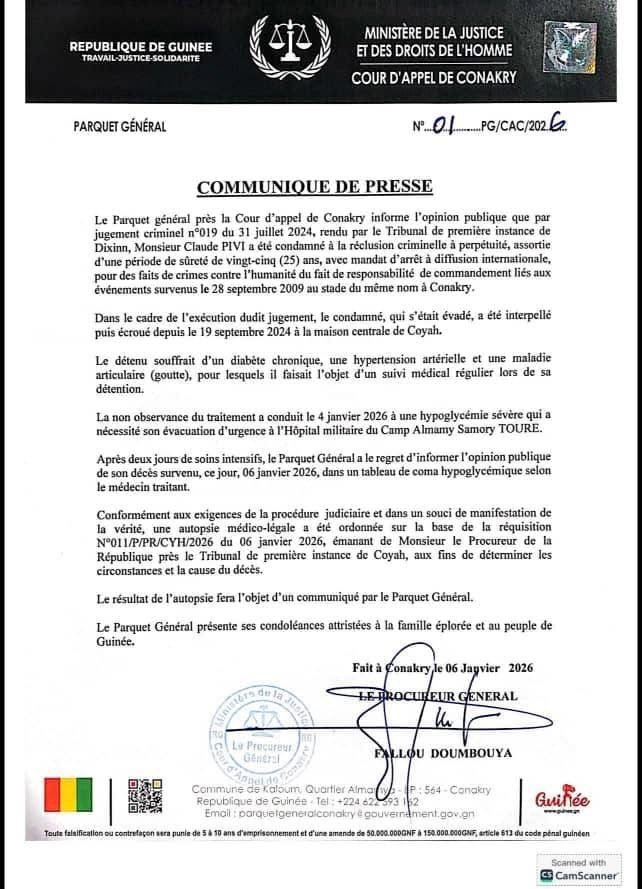 Le Parquet général près la Cour d’appel de Conakry a annoncé, ce mardi 06 janvier 2026, le décès en détention de Claude Pivi, condamné à la réclusion criminelle à perpétuité pour crimes contre l’humanité liés aux événements du 28 septembre 2009 au stade de Conakry à l’Hôpital militaire du camp Almamy Samory Touré.