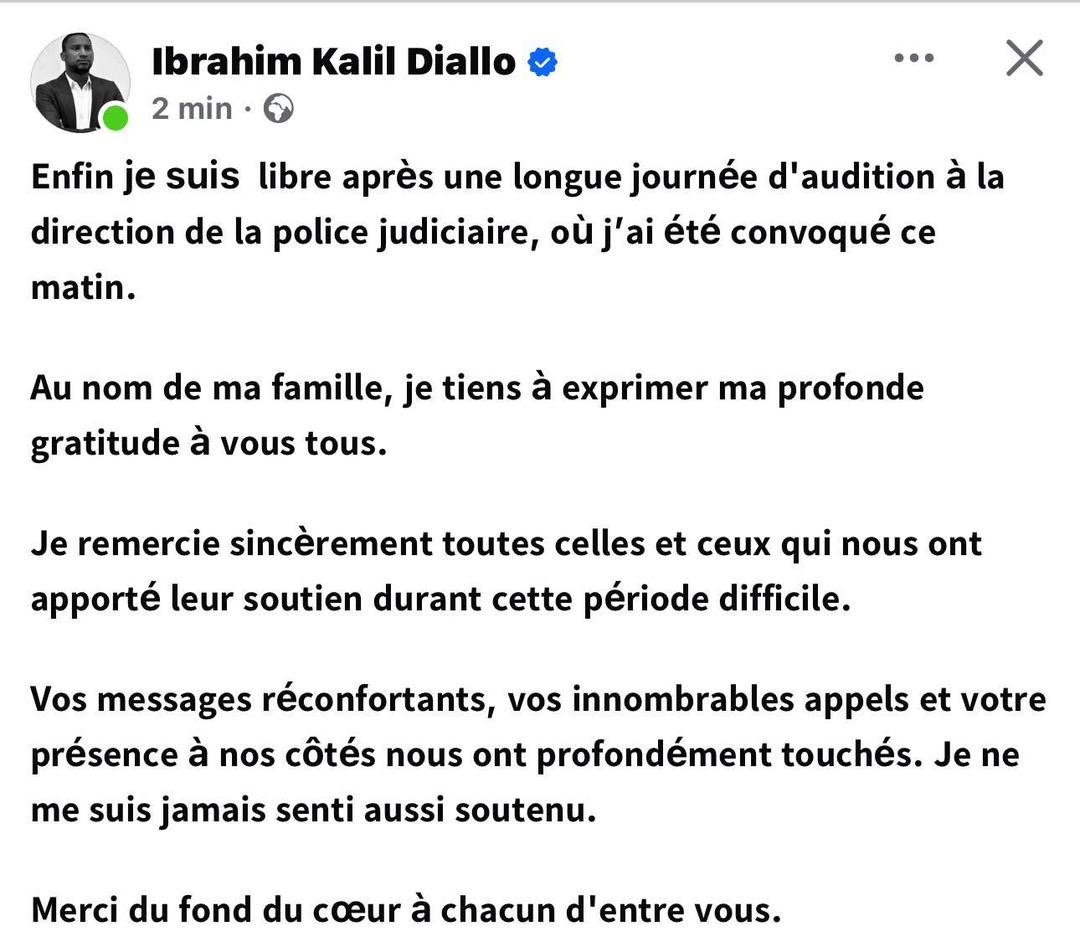 « Enfin je suis libre après une longue journée d’audition à la direction de la police judiciaire, où j’ai été convoqué ce matin. Au nom de ma famille, je tiens à exprimer ma profonde gratitude à vous tous.