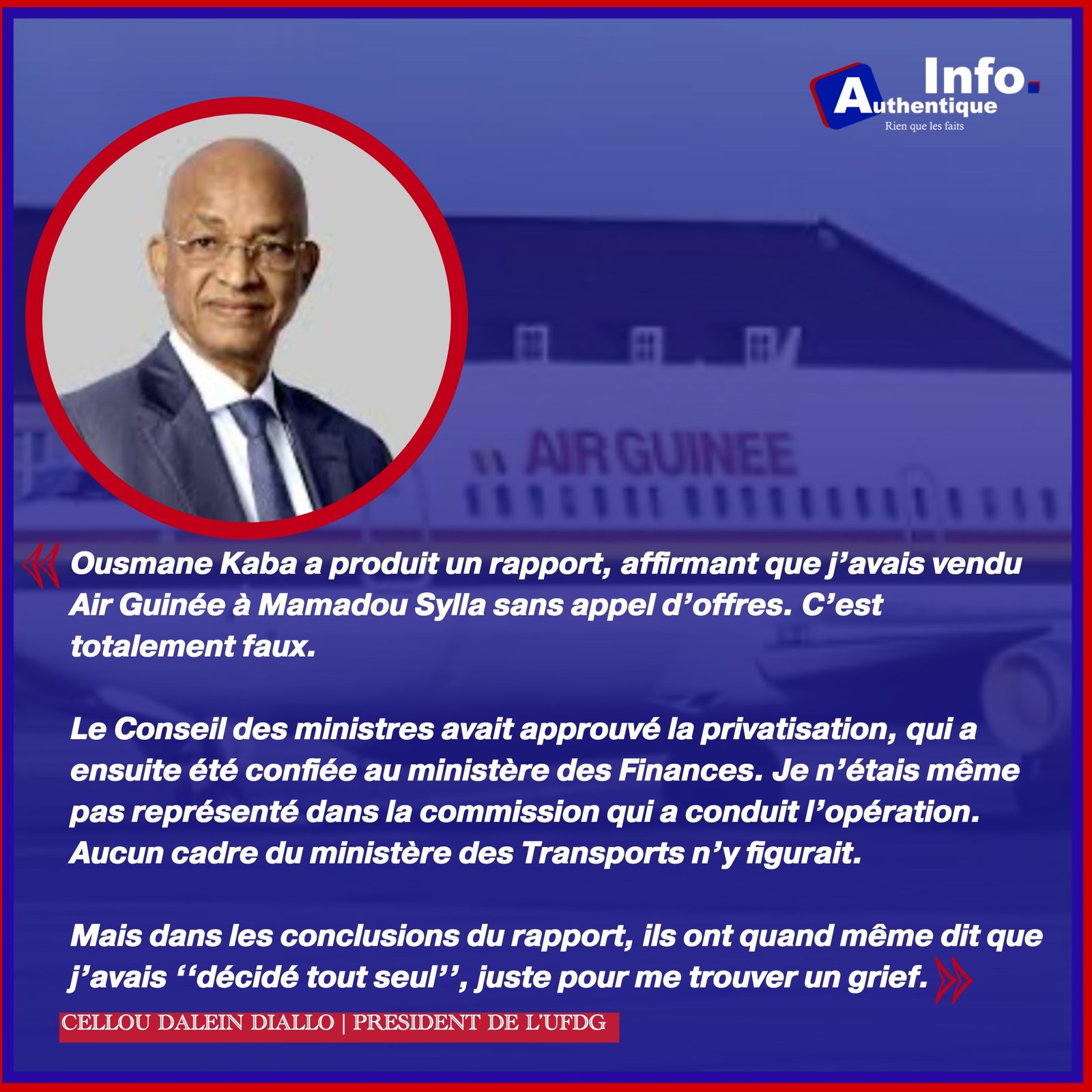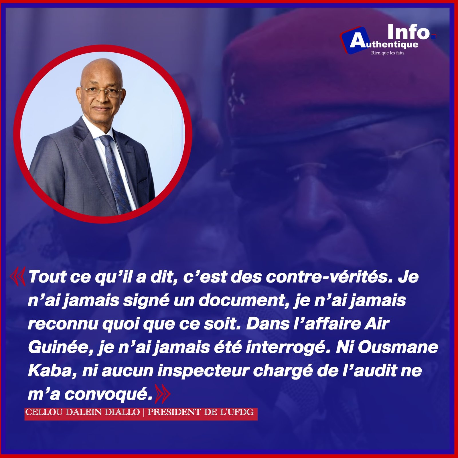 Cellou Dalein Diallo : Tout ce qu’il a dit, c’est des contre-vérités. Je n’ai jamais signé un document, je n’ai jamais reconnu quoi que ce soit. Dans l’affaire Air Guinée, je n’ai jamais été interrogé. Ni Ousmane Kaba, ni aucun inspecteur chargé de l’audit ne m’a convoqué.