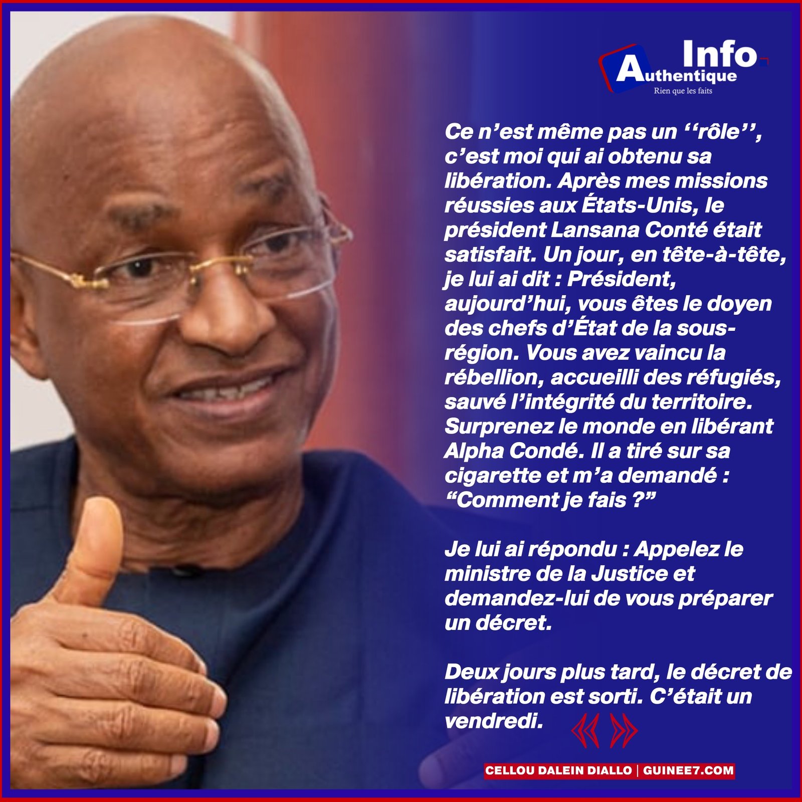 Ce n’est même pas un ‘‘rôle’’, c’est moi qui ai obtenu sa libération. Après mes missions réussies aux États-Unis, le président Lansana Conté était satisfait. Un jour, en tête-à-tête, je lui ai dit : Président, aujourd’hui, vous êtes le doyen des chefs d’État de la sous-région. Vous avez vaincu la rébellion, accueilli des réfugiés, sauvé l’intégrité du territoire. Surprenez le monde en libérant Alpha Condé. Il a tiré sur sa cigarette et m’a demandé : “Comment je fais ?”