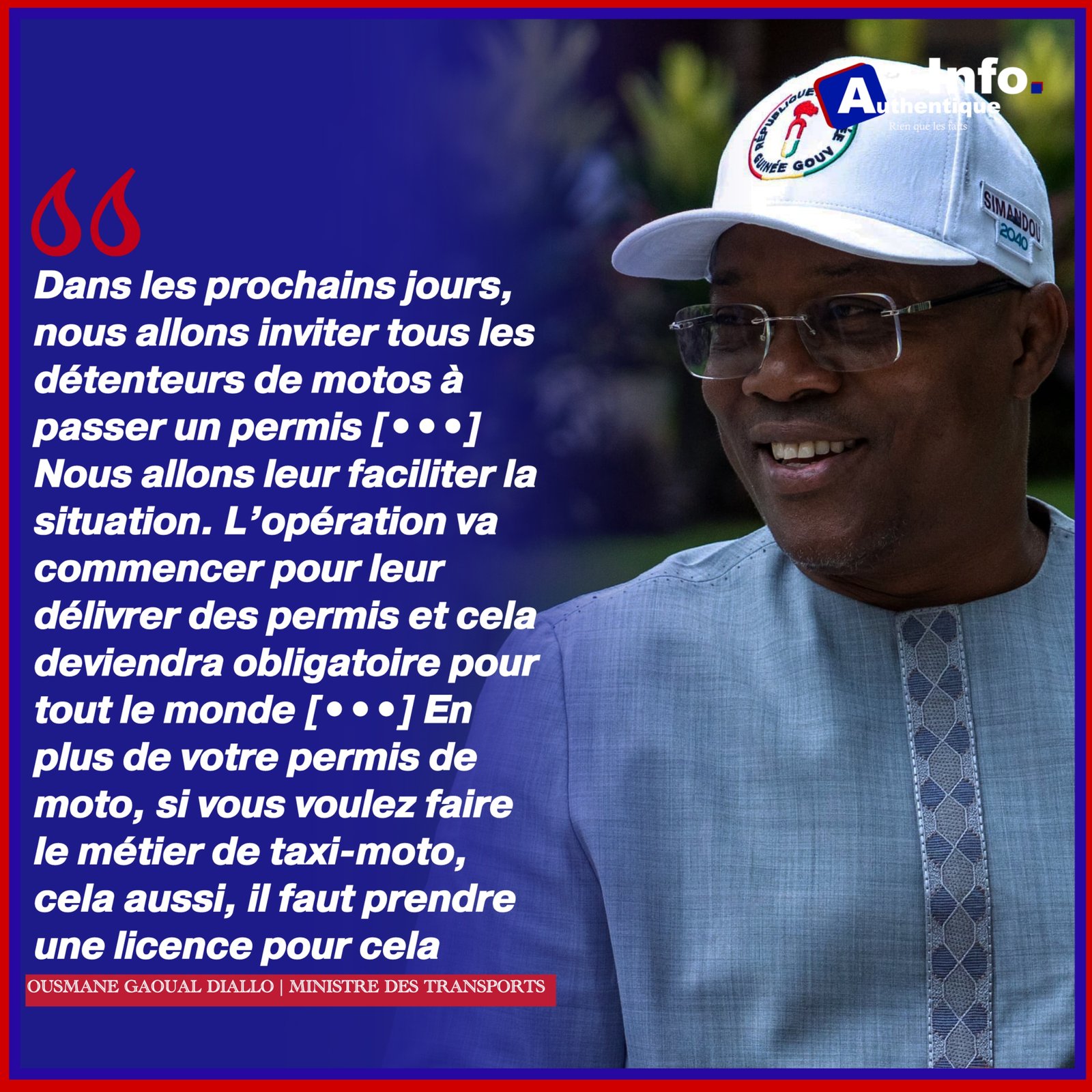 ‘’Dans les prochains jours, nous allons inviter tous les détenteurs de motos à passer un permis’’, assure Ousmane Gaoual Diallo, avant de promettre que ‘’nous allons leur faciliter la situation. L’opération va commencer pour leur délivrer des permis et cela deviendra obligatoire pour tout le monde’’.