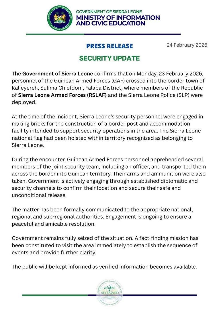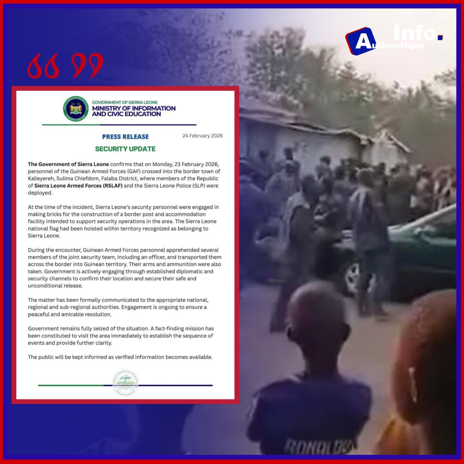 Le Gouvernement de la Sierra Leone confirme que le lundi 23 février 2026, des éléments des Forces armées guinéennes (GAF) ont pénétré dans la ville frontalière de Kalieyereh, chefferie de Sulima, district de Falaba, où des membres des Forces armées de la République de Sierra Leone (RSLAF) et de la Police de Sierra Leone (SLP) étaient déployés.
