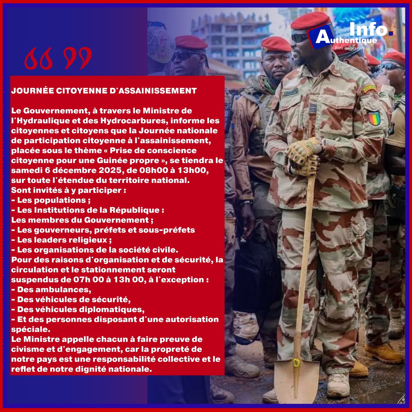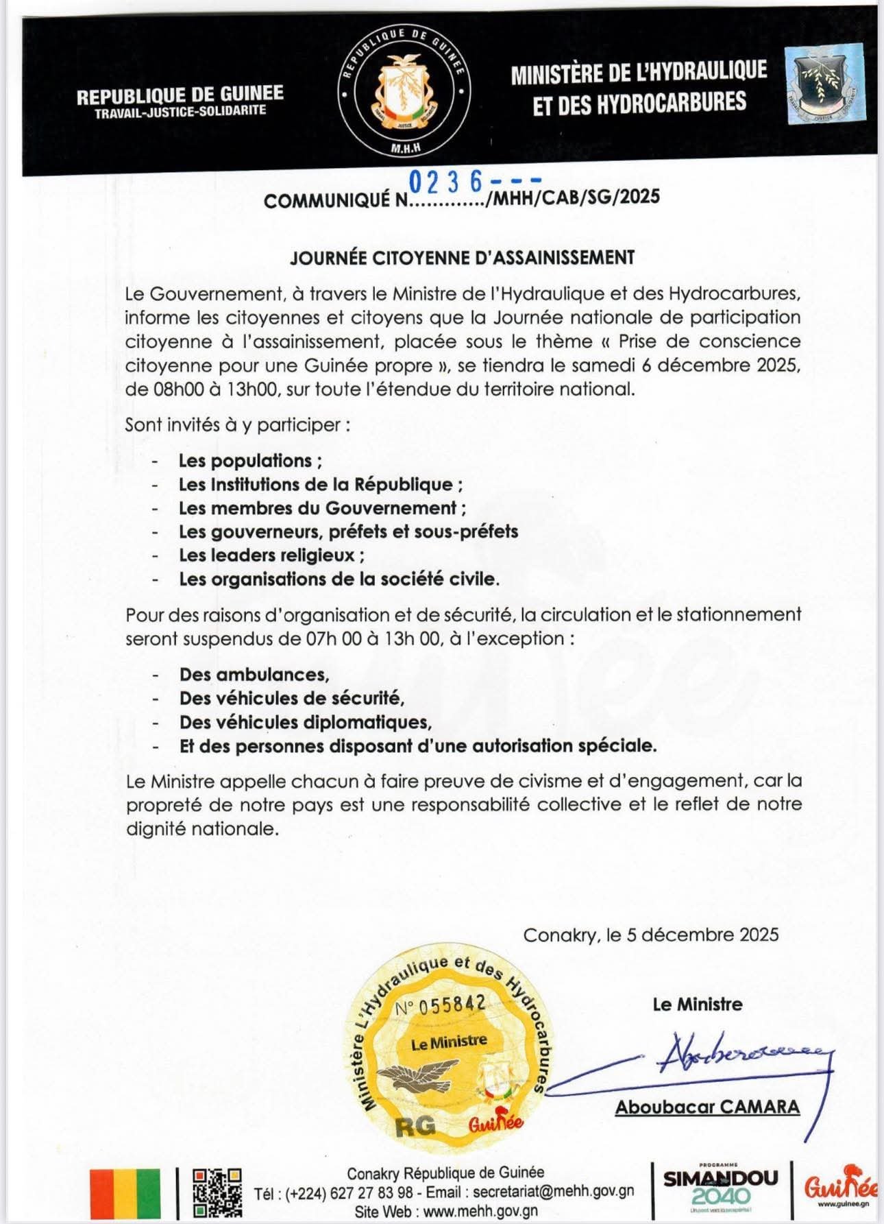 Le Gouvernement guinéen, par l’intermédiaire du ministre de l’Hydraulique et des Hydrocarbures, annonce la tenue de la Journée nationale de participation citoyenne à l’assainissement ce samedi 6 décembre 2025, de 08h00 à 13h00, sur l’ensemble du territoire national. Placée sous le thème « Prise de conscience citoyenne pour une Guinée propre », cette initiative vise à encourager une mobilisation collective autour de l’hygiène et du civisme environnemental.