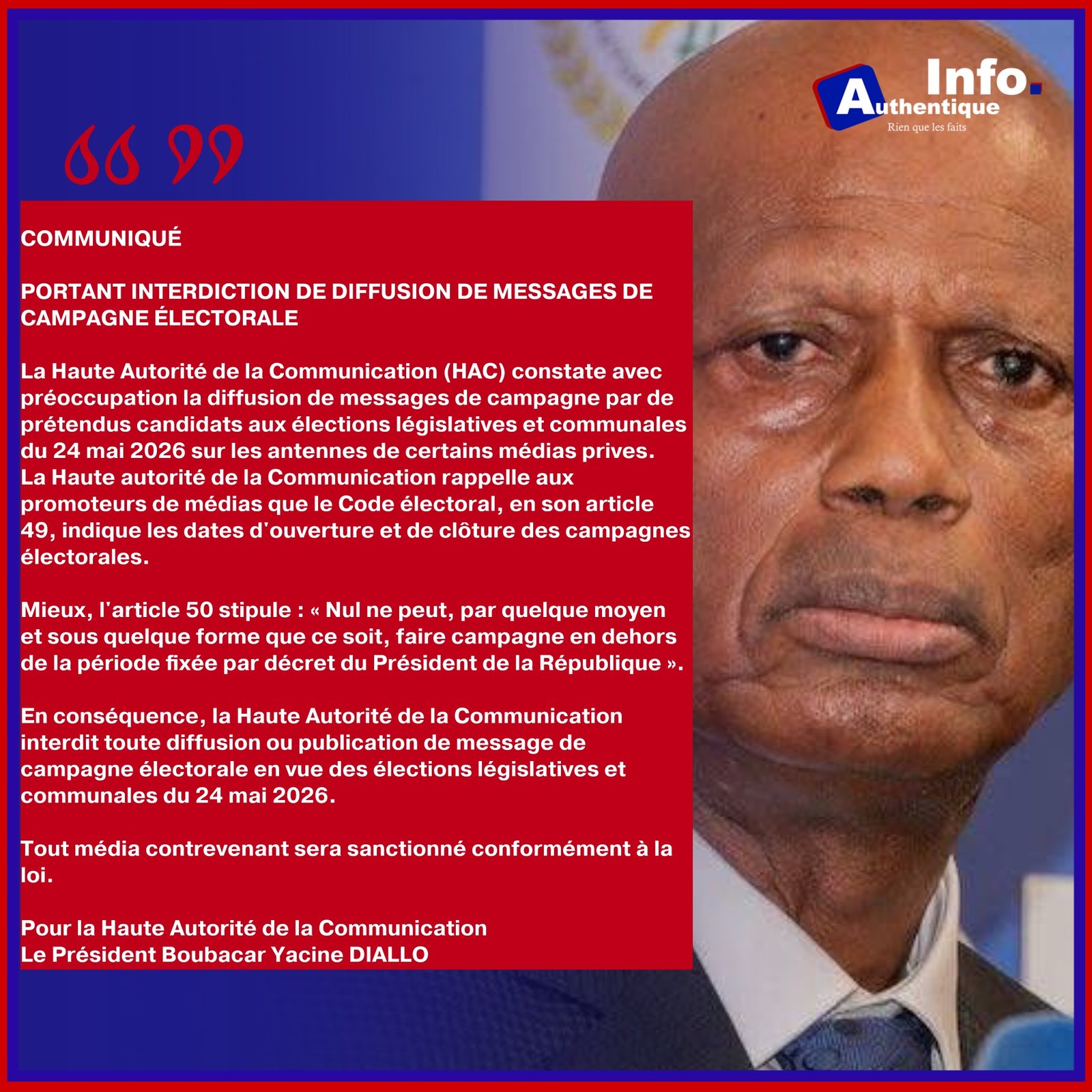 En conséquence, le régulateur “interdit toute diffusion ou publication de message de campagne électorale en vue des élections législatives et communales du 24 mai 2026.”