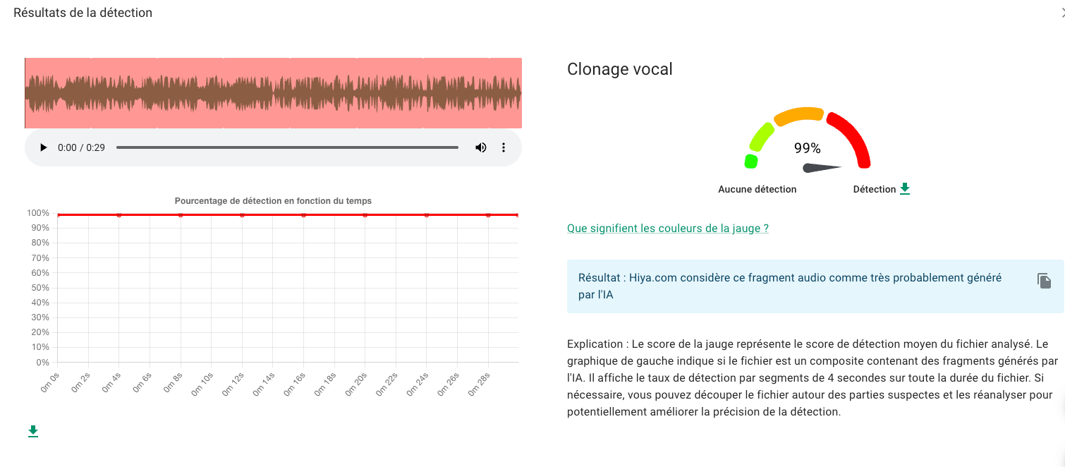 Nous avons utilisé l’outil InVid pour authentifier le prétendu reportage (voici comment procéder). Dès l’importation de la prétendue vidéo de 30 secondes, hiya.com a indiqué que l’audio ou le son est un clonage vocal. Il émane à 99% d’une intelligence artificielle.