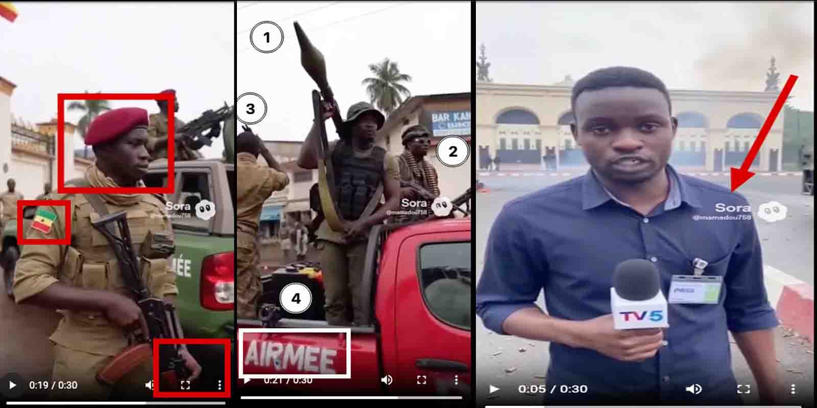 Sur cette autre capture, nous observons plusieurs déformations visuelles. Quant à l’environnement, il ne ressemble pas à Conakry. Les insignes des prétendus militaires dont les regards sont figés dans le vide ne ressemblent pas à ceux de l’armée guinéenne. Sur le véhicule rouge au milieu en couleur, vers le bas, nous remarquons l’erreur orthographique “airmée” au lieu de “armée’’.