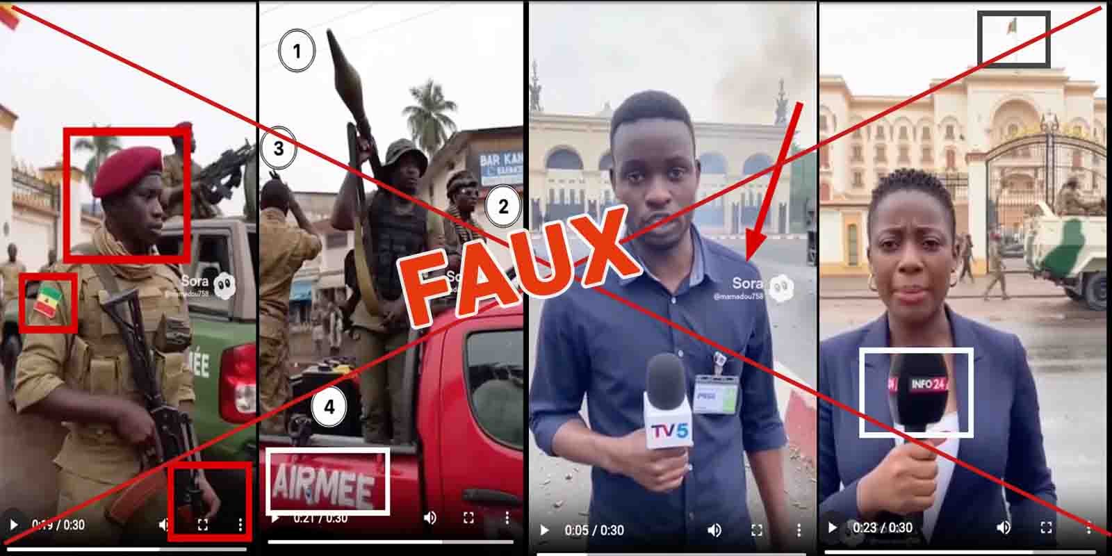 L’analyse visuelle révèle sur le prétendu reportage le logo de Sora et le pseudo de l’utilisateur @mamadou758 l’ayant générée.