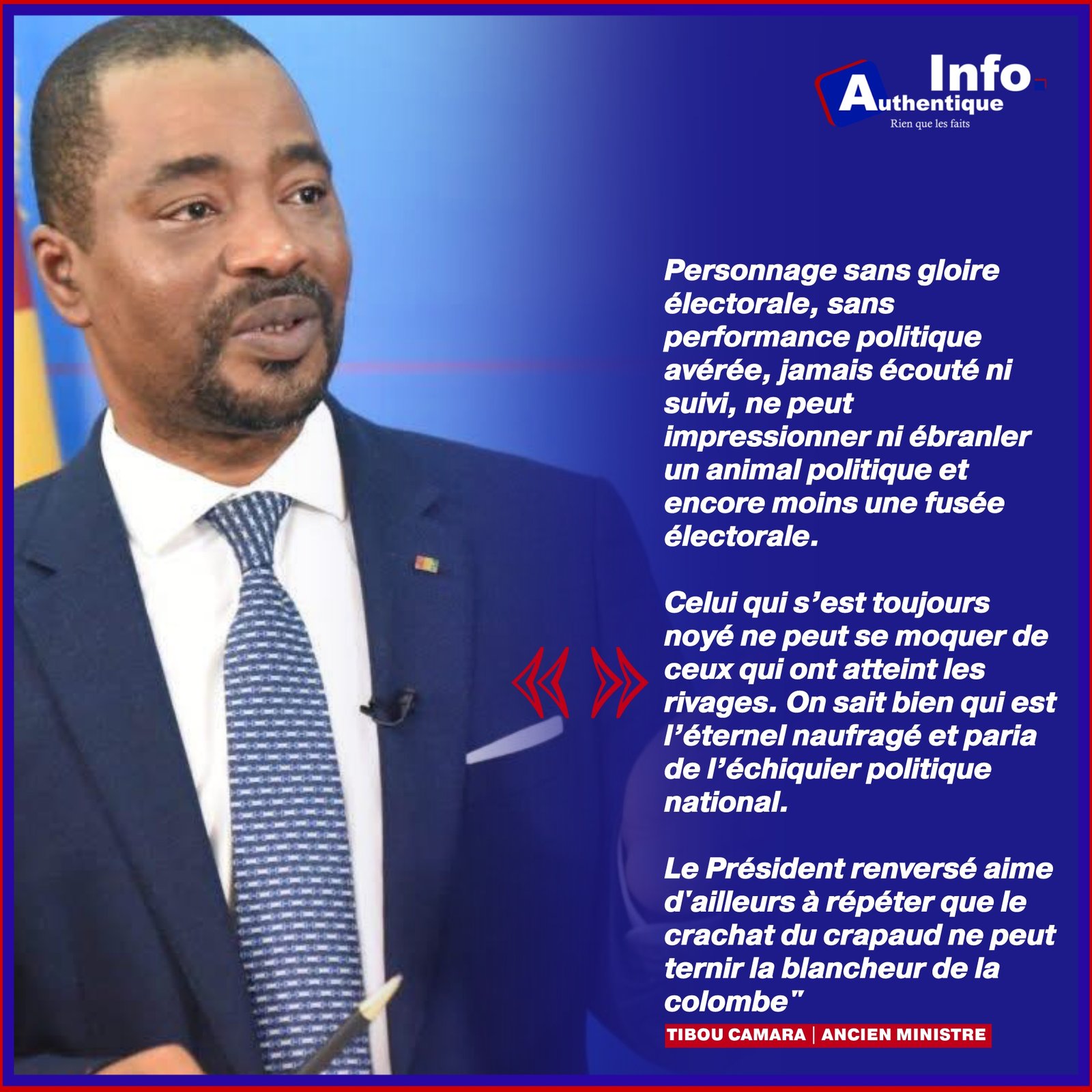 Un personnage sans gloire électorale, sans performance politique avérée, jamais écouté ni suivi, ne peut impressionner ni ébranler un animal politique et encore moins une fusée électorale. Celui qui s’est toujours noyé ne peut se moquer de ceux qui ont atteint les rivages. On sait bien qui est l’éternel naufragé et paria de l’échiquier politique national. Le Président renversé aime d’ailleurs à répéter que « le crachat du crapaud ne peut ternir la blancheur de la colombe ».